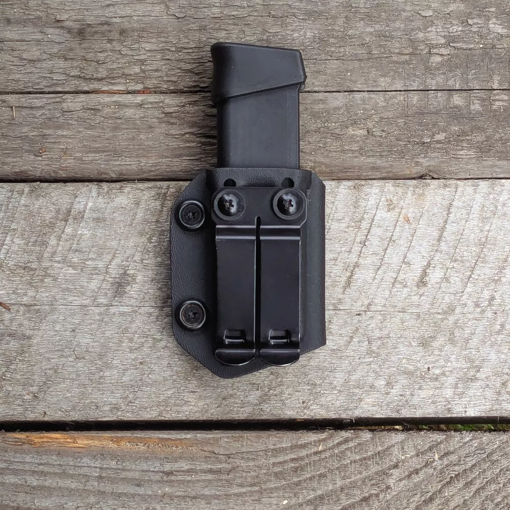 Durable kydex magazine carrier. Enables carrying two magazines, outside the waistband (OWB). Secure and robust, provides fast reload. Variable clip sizes.